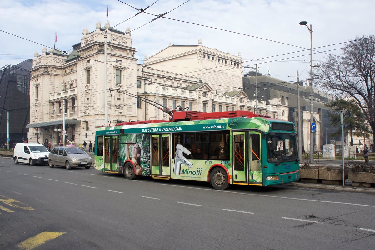 Serbien / Stadtbus Belgrad / City Bus Beograd: Oberleitungsbus BKM (Belkommunmash) AKSM-321 - Wagen 2026 der GSP Belgrad, aufgenommen im Januar 2016 am Platz der Republik (Trg Republike) in Belgrad.