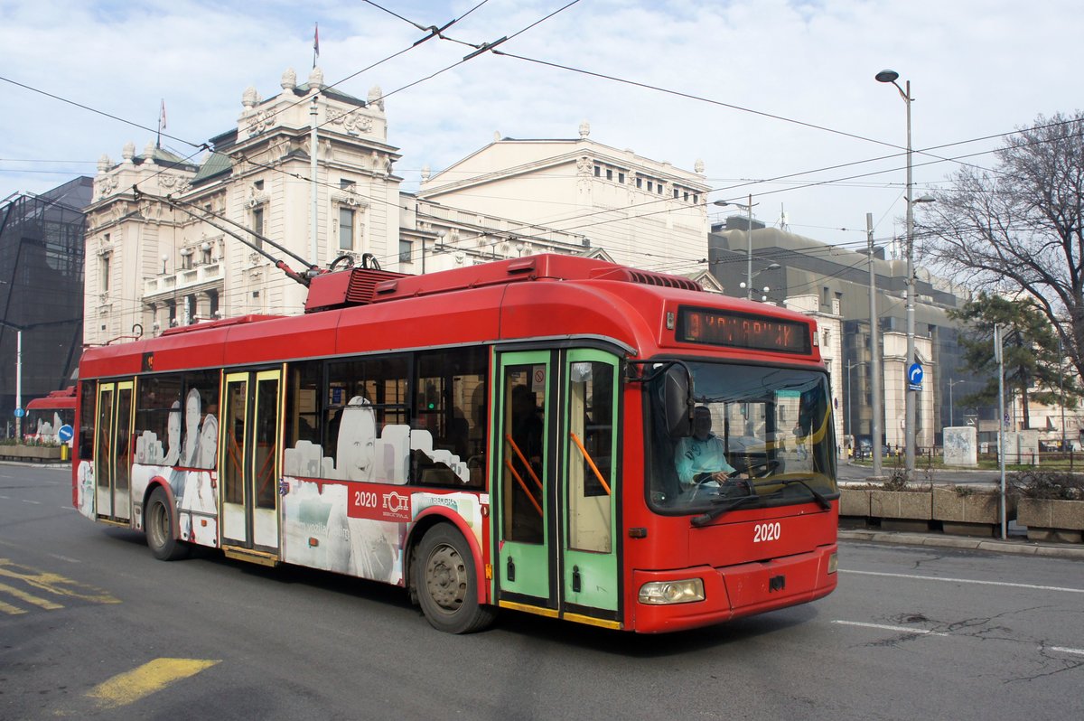 Serbien / Stadtbus Belgrad / City Bus Beograd: Oberleitungsbus BKM (Belkommunmash) AKSM-321 - Wagen 2020 der GSP Belgrad, aufgenommen im Januar 2016 am Platz der Republik (Trg Republike) in Belgrad.