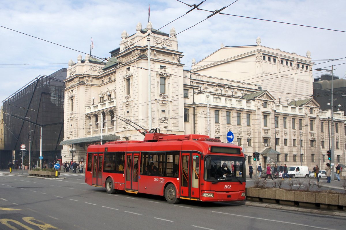Serbien / Stadtbus Belgrad / City Bus Beograd: Oberleitungsbus BKM (Belkommunmash) AKSM-321 - Wagen 2002 der GSP Belgrad, aufgenommen im Januar 2016 am Platz der Republik (Trg Republike) in Belgrad.