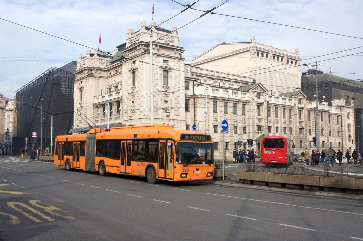 Serbien / Stadtbus Belgrad / City Bus Beograd: Oberleitungsbus BKM (Belkommunmash) AKSM-333 - Wagen 2166 der GSP Belgrad, aufgenommen im Januar 2016 am Platz der Republik (Trg Republike) in Belgrad.