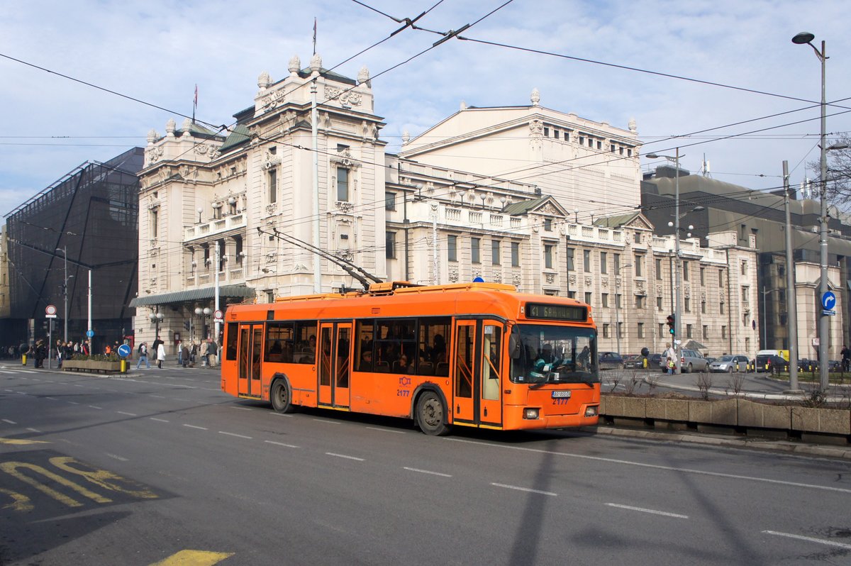 Serbien / Stadtbus Belgrad / City Bus Beograd: Oberleitungsbus BKM (Belkommunmash) AKSM-321 - Wagen 2177 der GSP Belgrad, aufgenommen im Januar 2016 am Platz der Republik (Trg Republike) in Belgrad.