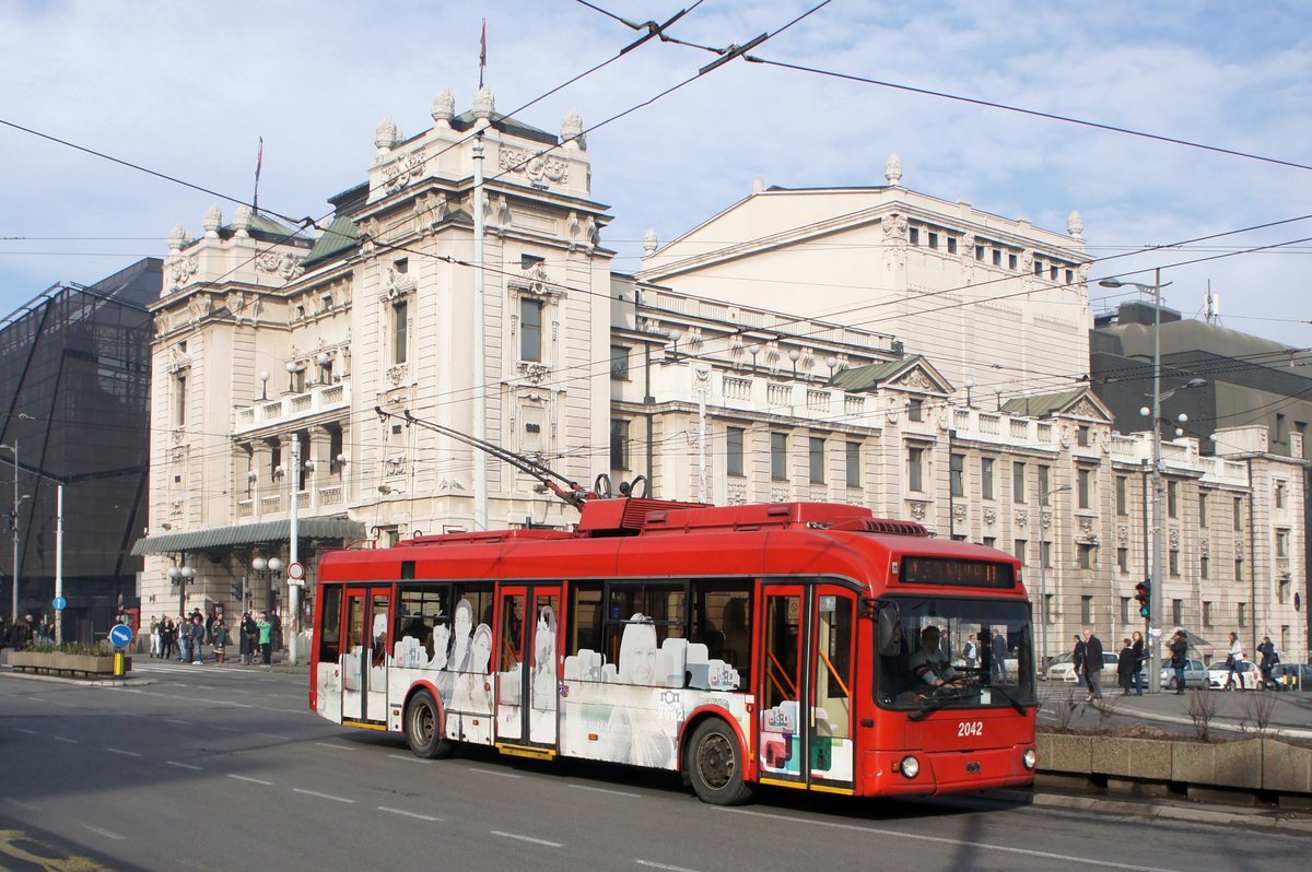 Serbien / Stadtbus Belgrad / City Bus Beograd: Oberleitungsbus BKM (Belkommunmash) AKSM-321 - Wagen 2042 der GSP Belgrad, aufgenommen im Januar 2016 am Platz der Republik (Trg Republike) in Belgrad.
