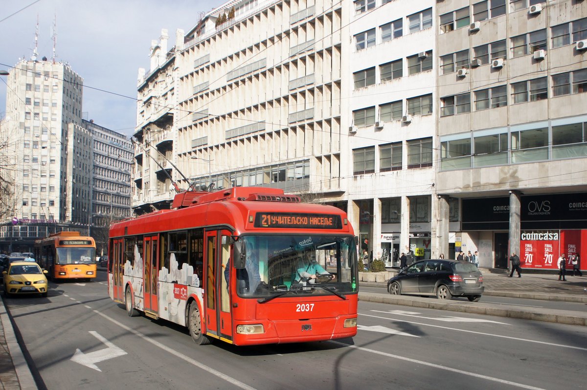 Serbien / Stadtbus Belgrad / City Bus Beograd: Oberleitungsbus BKM (Belkommunmash) AKSM-321 - Wagen 2037 der GSP Belgrad, aufgenommen im Januar 2016 in der Nähe der Haltestelle "Terazije" in Belgrad.