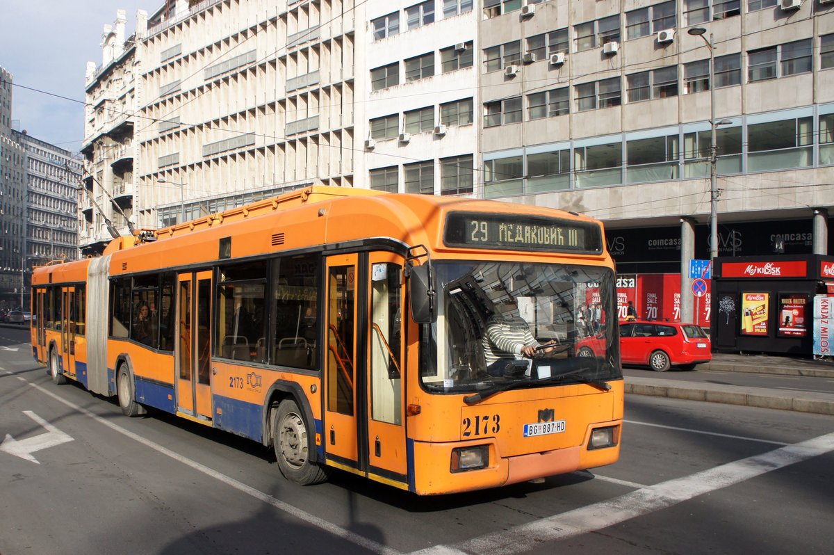 Serbien / Stadtbus Belgrad / City Bus Beograd: Oberleitungsbus BKM (Belkommunmash) AKSM-333 - Wagen 2173 der GSP Belgrad, aufgenommen im Januar 2016 in der Nähe der Haltestelle "Terazije" in Belgrad.