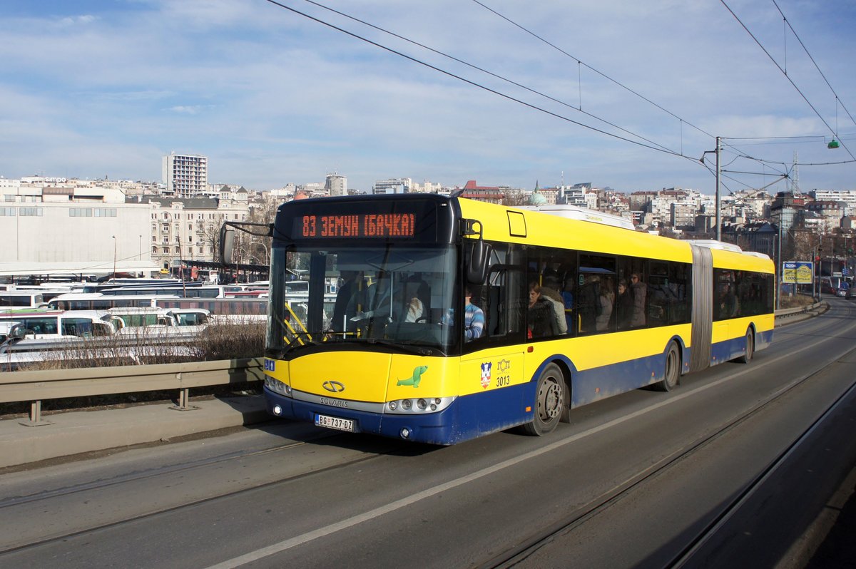Serbien / Stadtbus Belgrad / City Bus Beograd: Solaris Urbino 18 - Wagen 3013 der GSP Belgrad, aufgenommen im Januar 2016 auf der Brücke über die Save in der Nähe der Haltestelle "Ekonomski fakultet" in Belgrad.