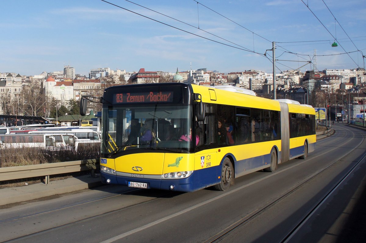 Serbien / Stadtbus Belgrad / City Bus Beograd: Solaris Urbino 18 - Wagen 3098 der GSP Belgrad, aufgenommen im Januar 2016 auf der Brücke über die Save in der Nähe der Haltestelle "Ekonomski fakultet" in Belgrad.
