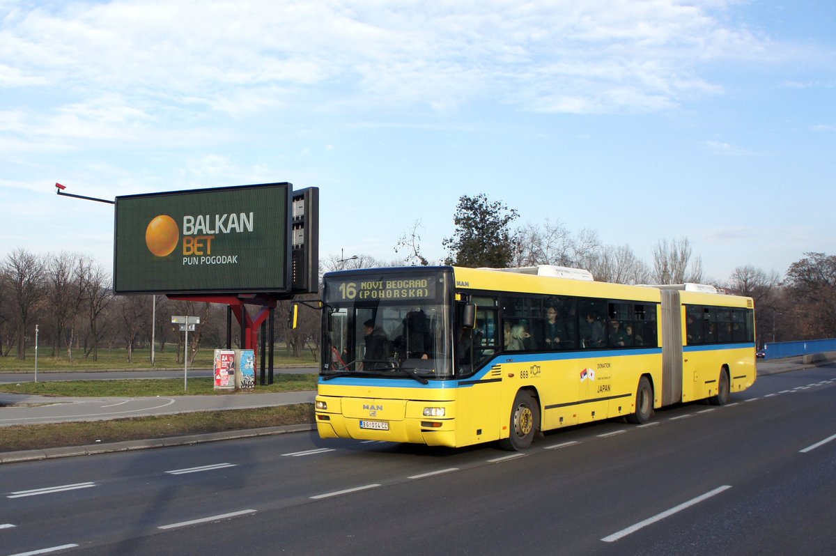 Serbien / Stadtbus Belgrad / City Bus Beograd: MAN SG 313 - Wagen 869 der GSP Belgrad, aufgenommen im Januar 2016 in der Nähe der Haltestelle "Bulevar Nikole Tesle" in Belgrad.