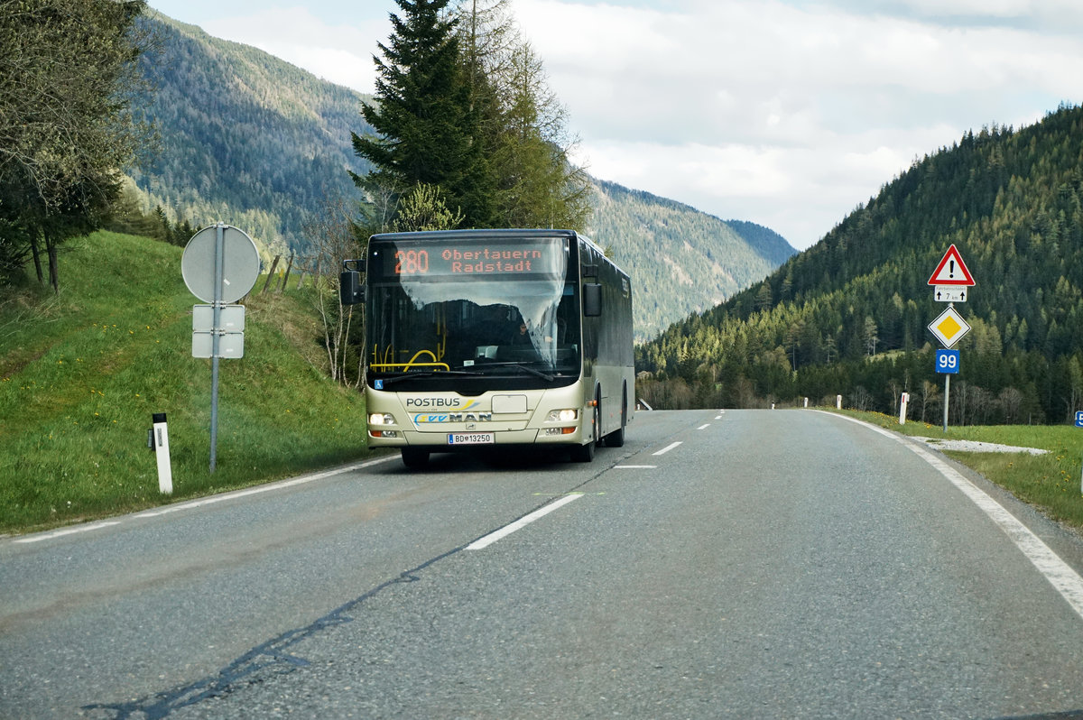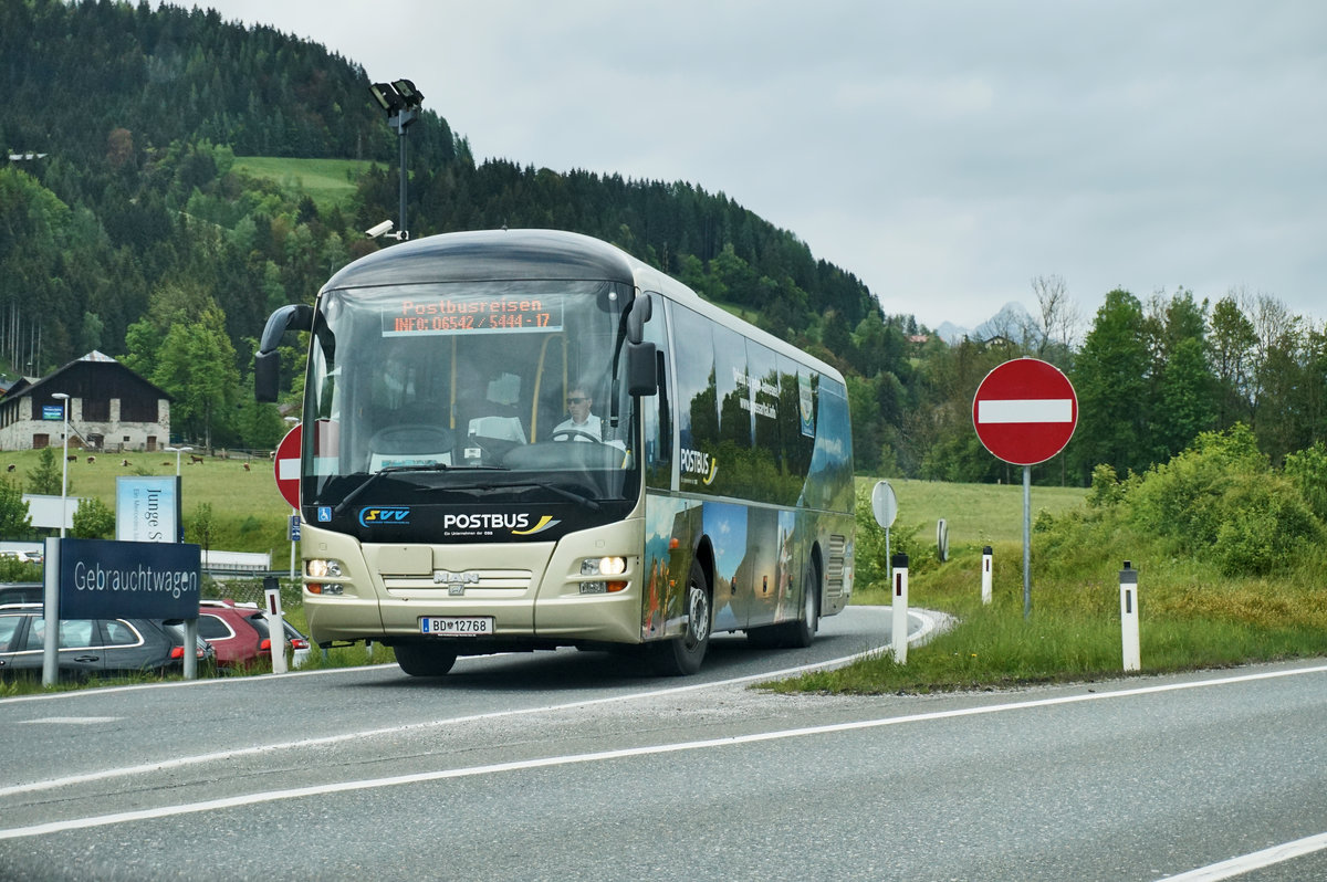Durch einen (Schilder-)Wald erreicht der MAN Lion's City M M-RV 3885 des Regionalverkehr Oberbayern vom Spitzingsee kommend am 17.05.2016 die Haltestelle Johannesbrücke in der Valepp