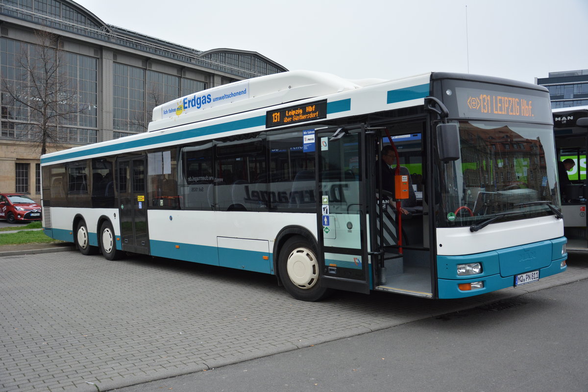 Am 15.04.2016 fährt MQ-PN 811 auf der Linie 131. Aufgenommen wurde ein MAN Niederflurbus der 2. Generation L, CNG / Leipzig Hauptbahnhof.