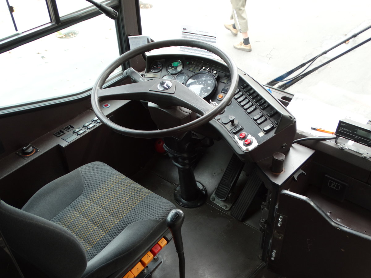 Cockpit eines Mercedes Benz O405 (ex Fahrschulbus VGF) am 04.09.16 beim Tag der Verkehrsgeschichte in Frankfurt
