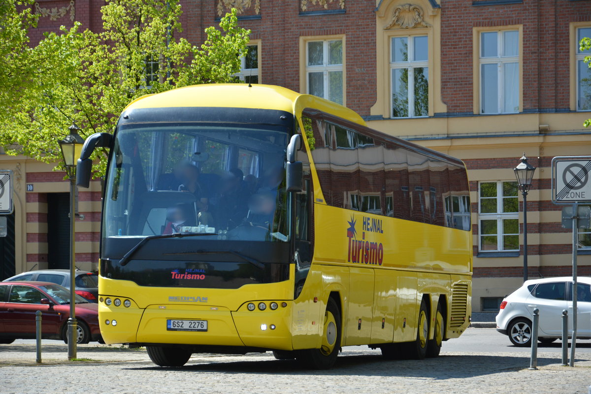 Dieser Neoplan Tourliner mit dem Kennzeichen 6S2-2276 hat sein Ziel erreicht. Aufgenommen am 05.05.2016, Potsdam Bassinplatz.