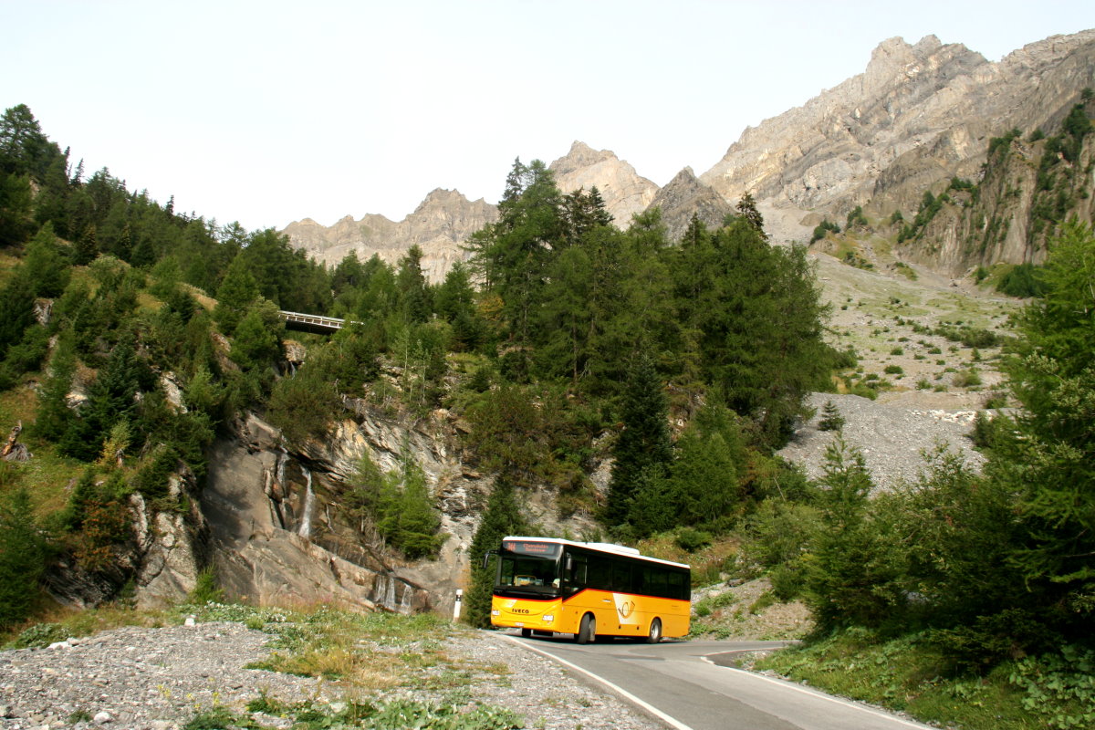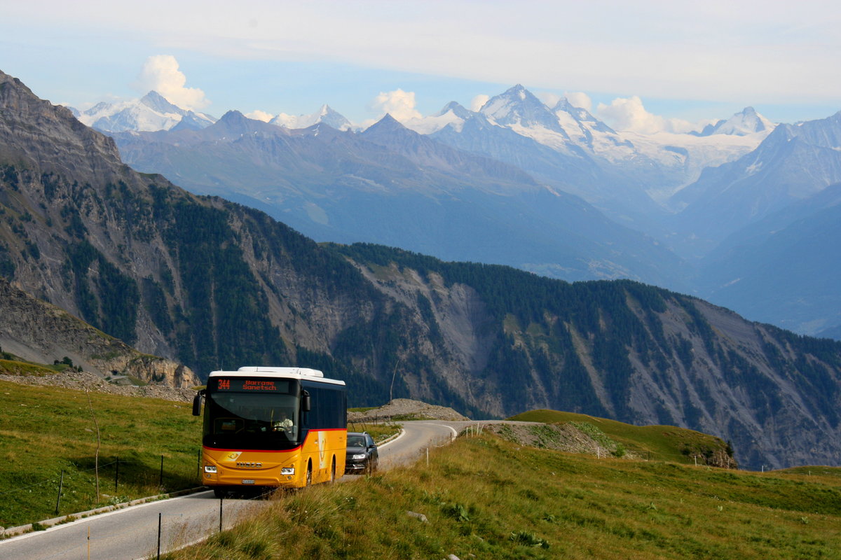 Ein Iveco Crossway Postauto auf der Linie 12.344 Sion - Chandolin-près-Savièse - Barrage du Sanetsch kurz vor dem Col du Sanetsch; 03.09.2016