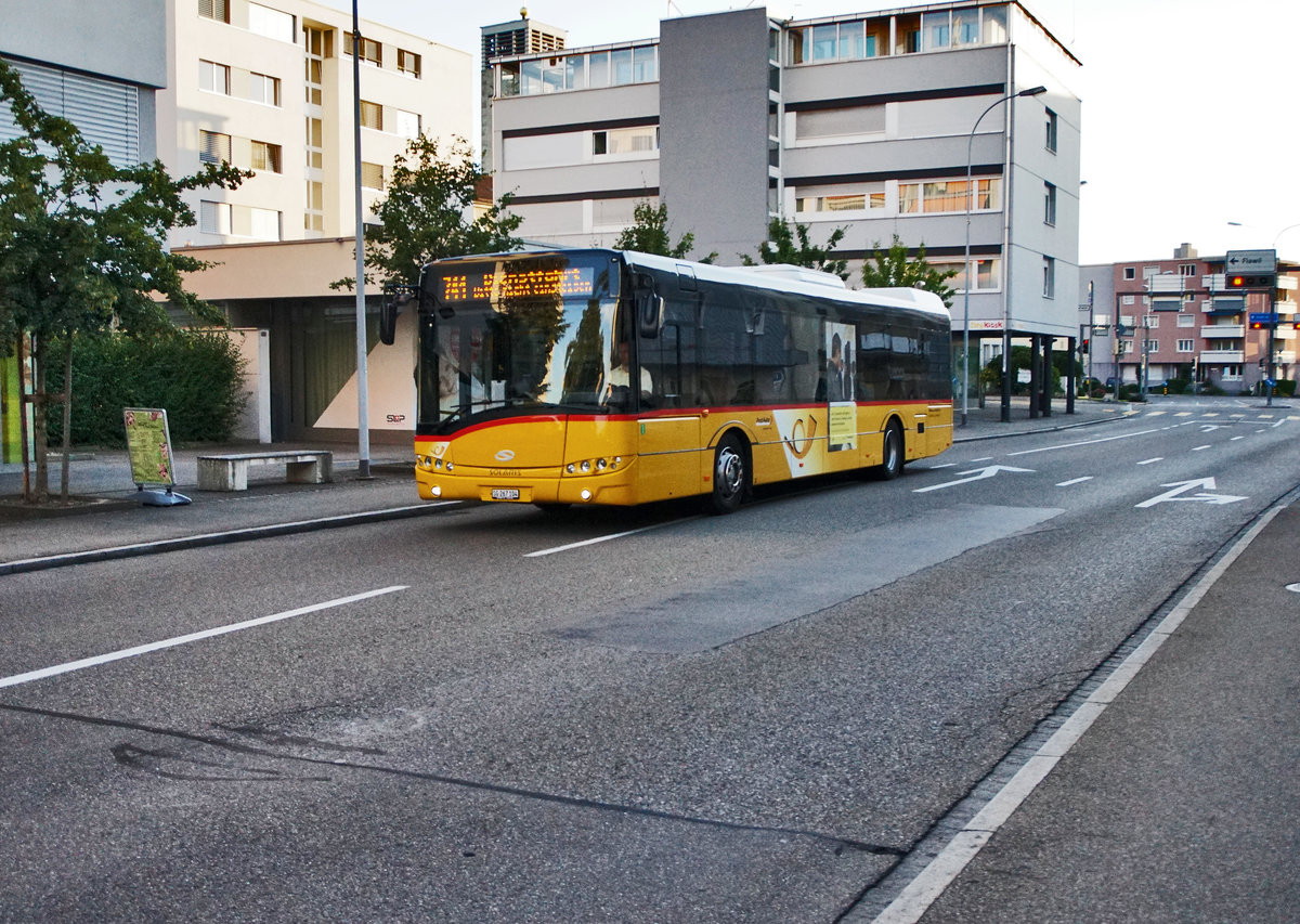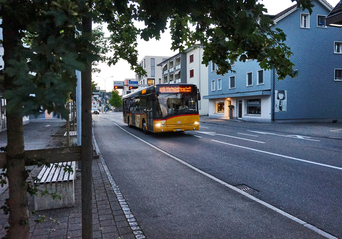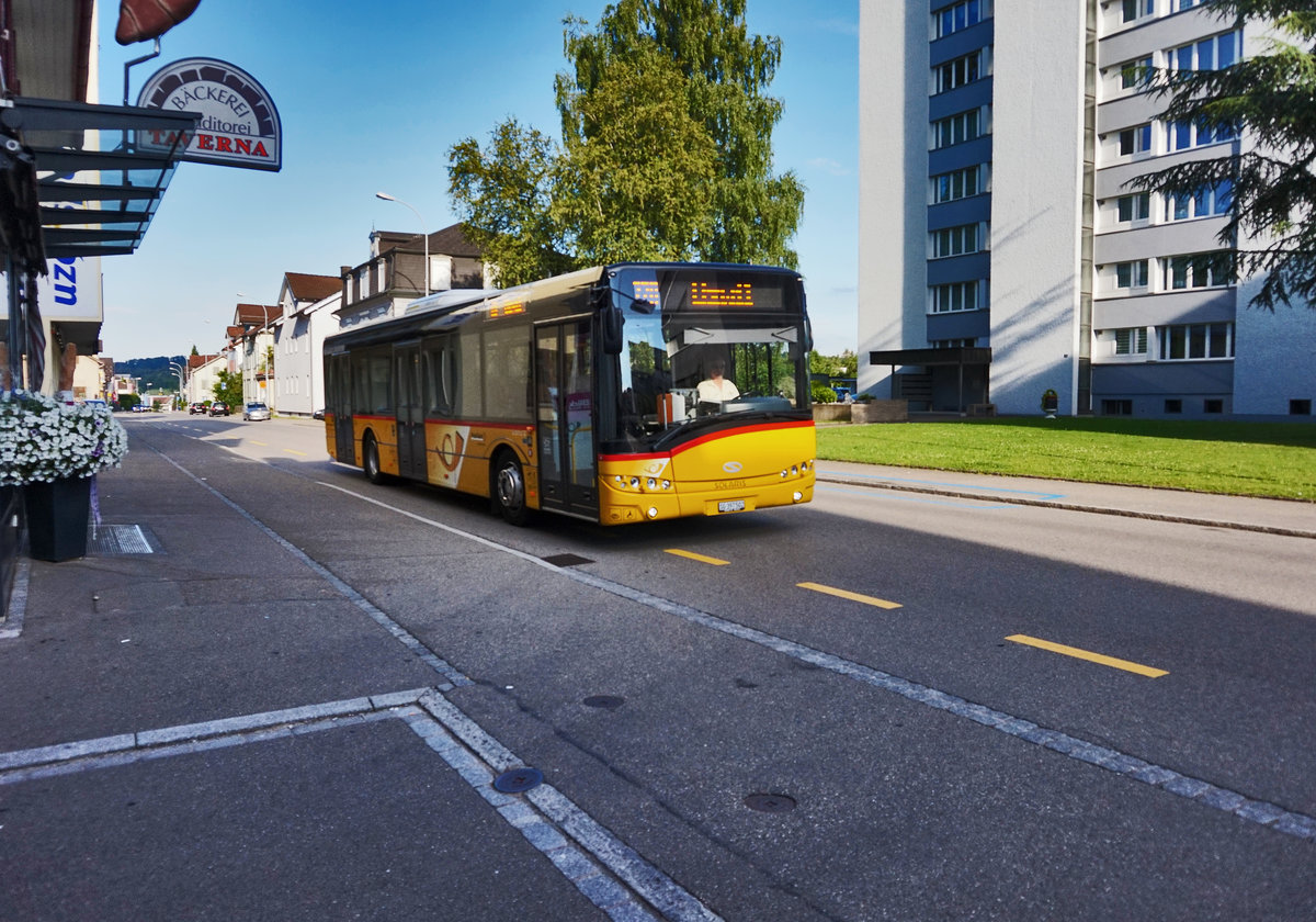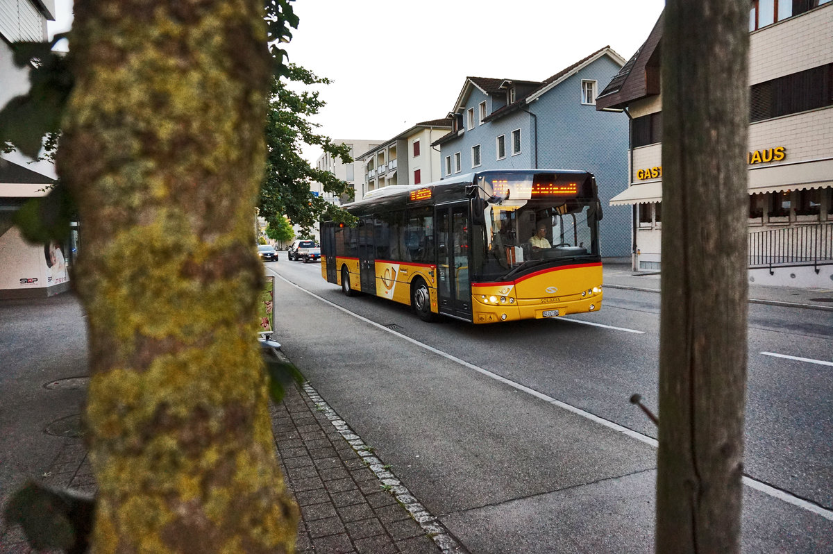 Ein SOLARIS Urbino von PostAuto, unterwegs als Dienstfahrt, zur Postautogarage in Oberbüren.