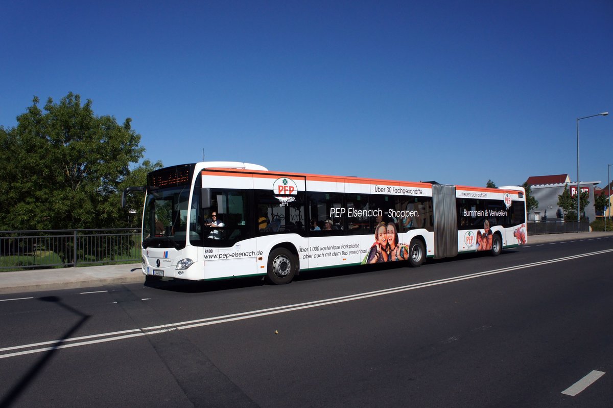 Stadtbus Eisenach: Mercedes-Benz Citaro C2 Gelenkbus der KVG Eisenach, eingesetzt im Stadtverkehr. Aufgenommen im August 2016 im Stadtgebiet von Eisenach.
