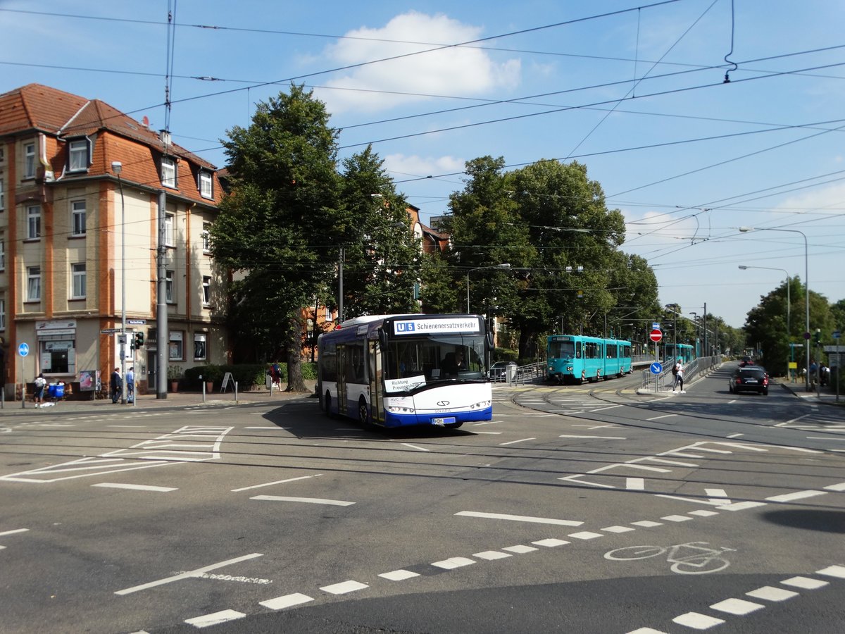 Transdev Solaris Urbino 18 (ex Stadtwerke Pforzheim) am 02.09.16 in Frankfurt Eckenheim als SEV auf der Linie U5
