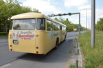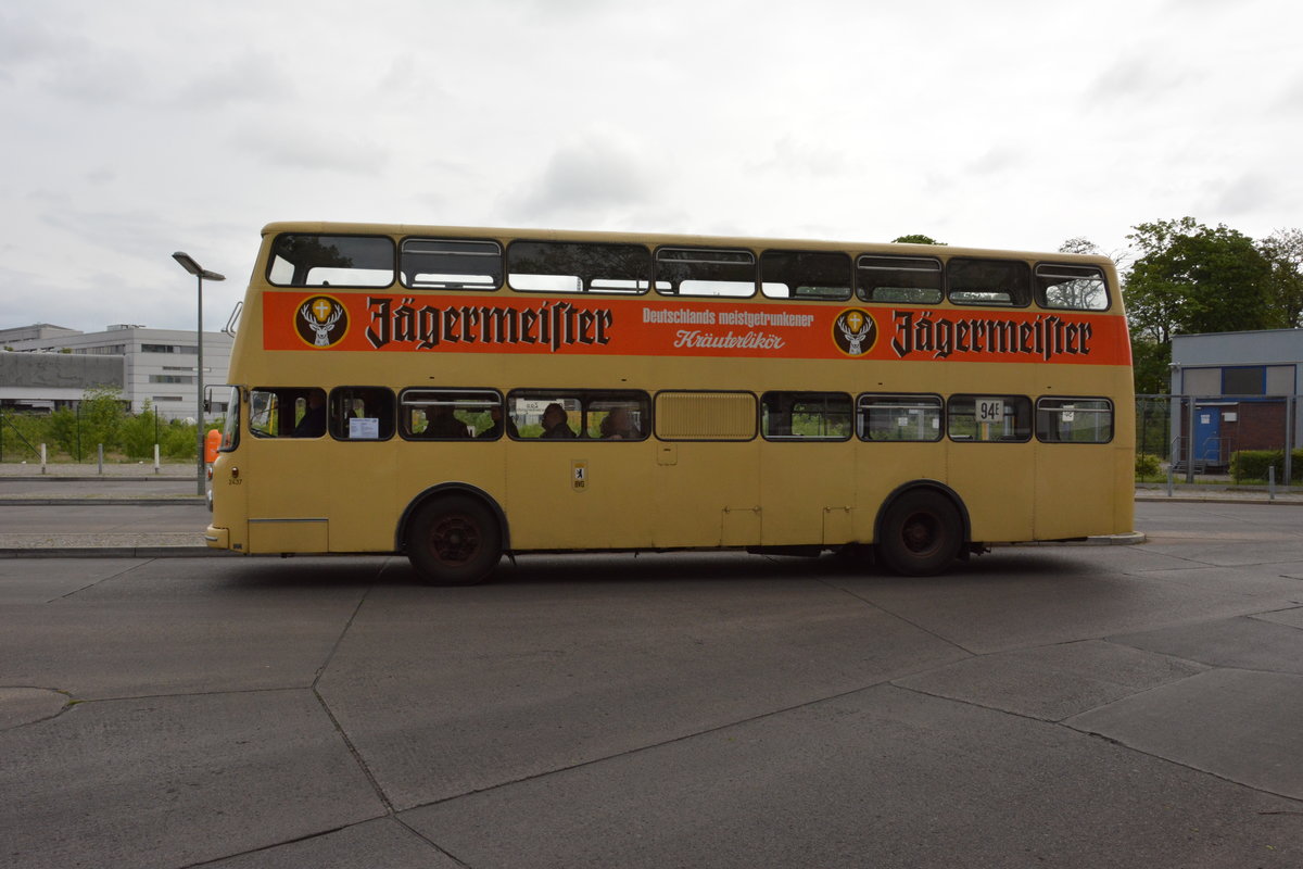 "50 Jahre Busse auf der Kantstraße", so hieß es zur Traditionsfahrt 2016. Auch mit dabei B-Z 2329H, Büssing DE 71. Aufgenommen an der Haltestelle, Flatowallee/Olympiastadion.