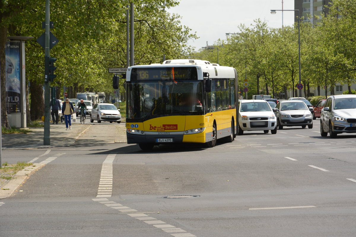 B-V 4375 fährt am 14.05.2016 auf der Linie 136 zum Omnibushof in Spandau. Aufgenommen wurde ein Solaris Urbino 18 / Gatower Straße Ecke Heerstraße.