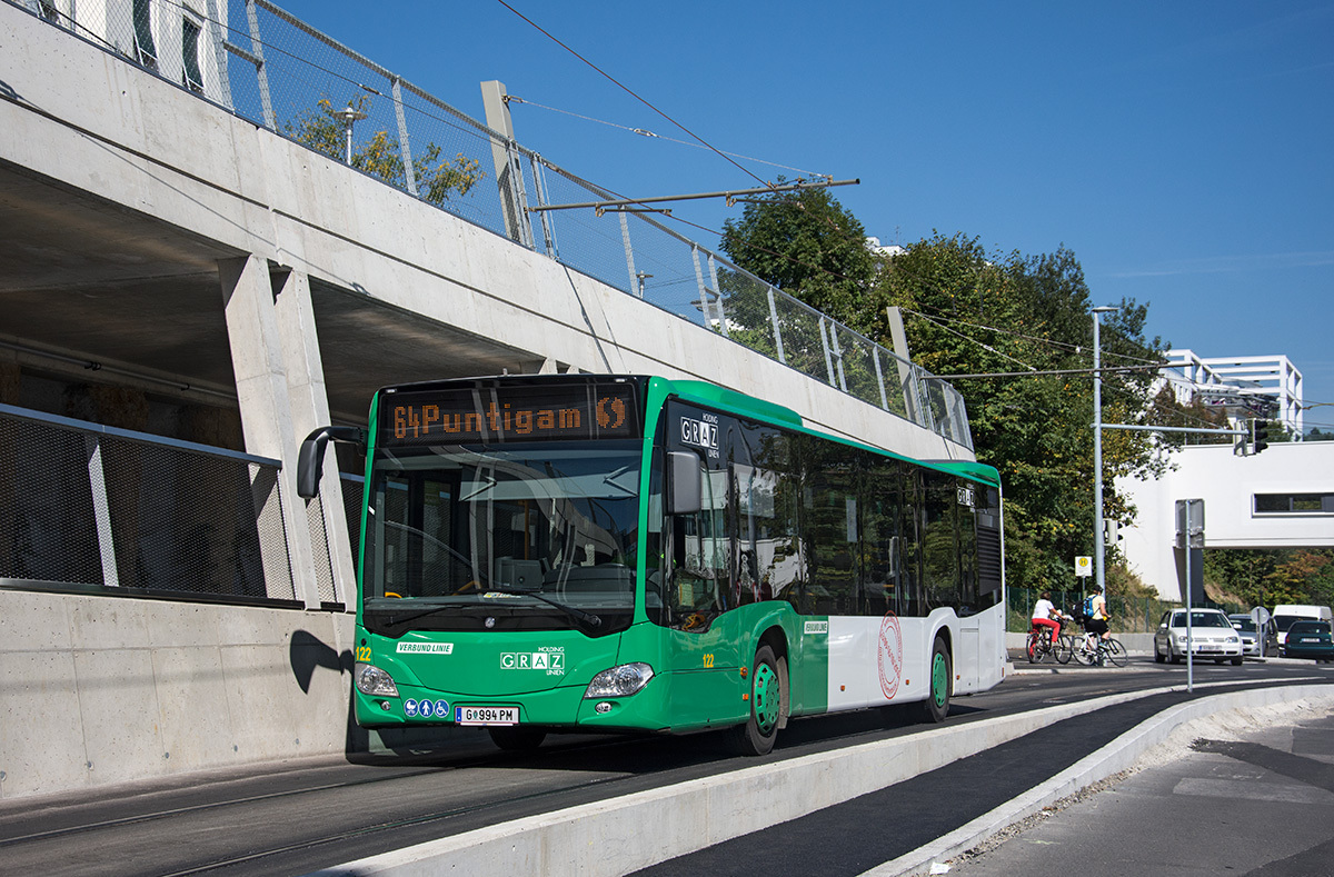 Ein Mercedes-Benz O 530 I (Nr. O 1517) von Kowatsch (Dr. Richard-Gruppe) fährt nahe der Haltestelle Villach Neue Heimat vorüber.