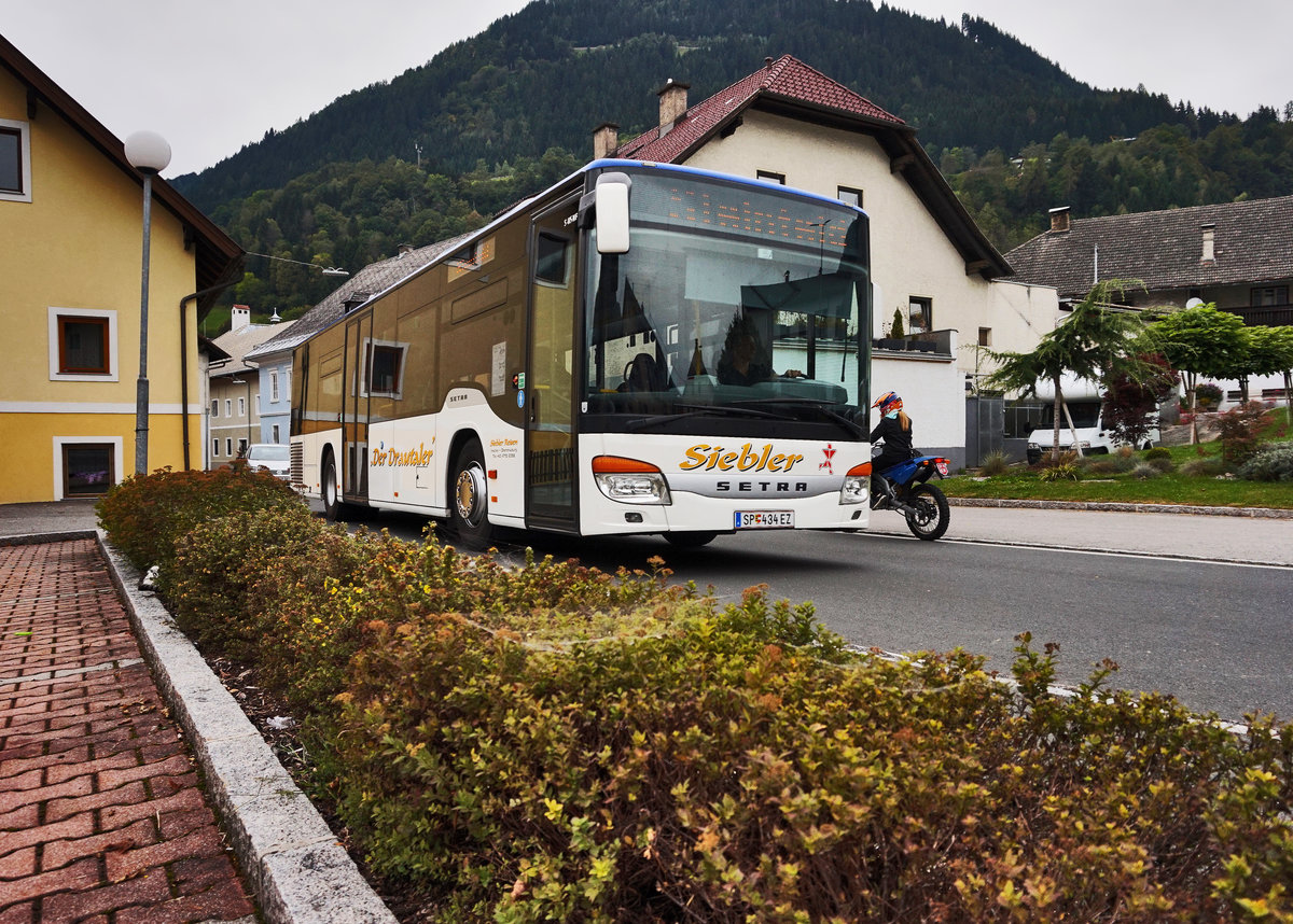 Ein Setra S 415 NF von Siebler Reisen fährt nahe der Haltestelle Steinfeld im Drautal Postamt vorüber.