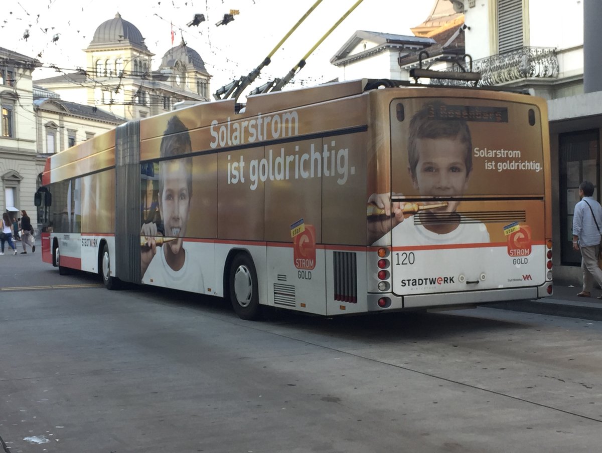 HESS 120 mit Teilwerbung fürs Stadtwerk Winterthur, verliess am 12.9.16 den Hauptbahnhof Winterthur.
