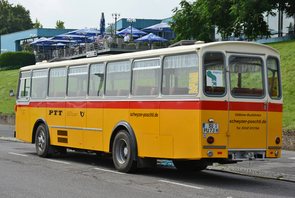 Saurer/Tüscher 3DUK-50 (ehemalige PTT-Zulassung P-24660), Baujahr 1973, insgesamt wurden 74 Fahrzeuge dieses Types hergestellt. Jetzt für Oldtimer-Bus-Rundfahrten eingesetzt. Bonn 14.08.2016