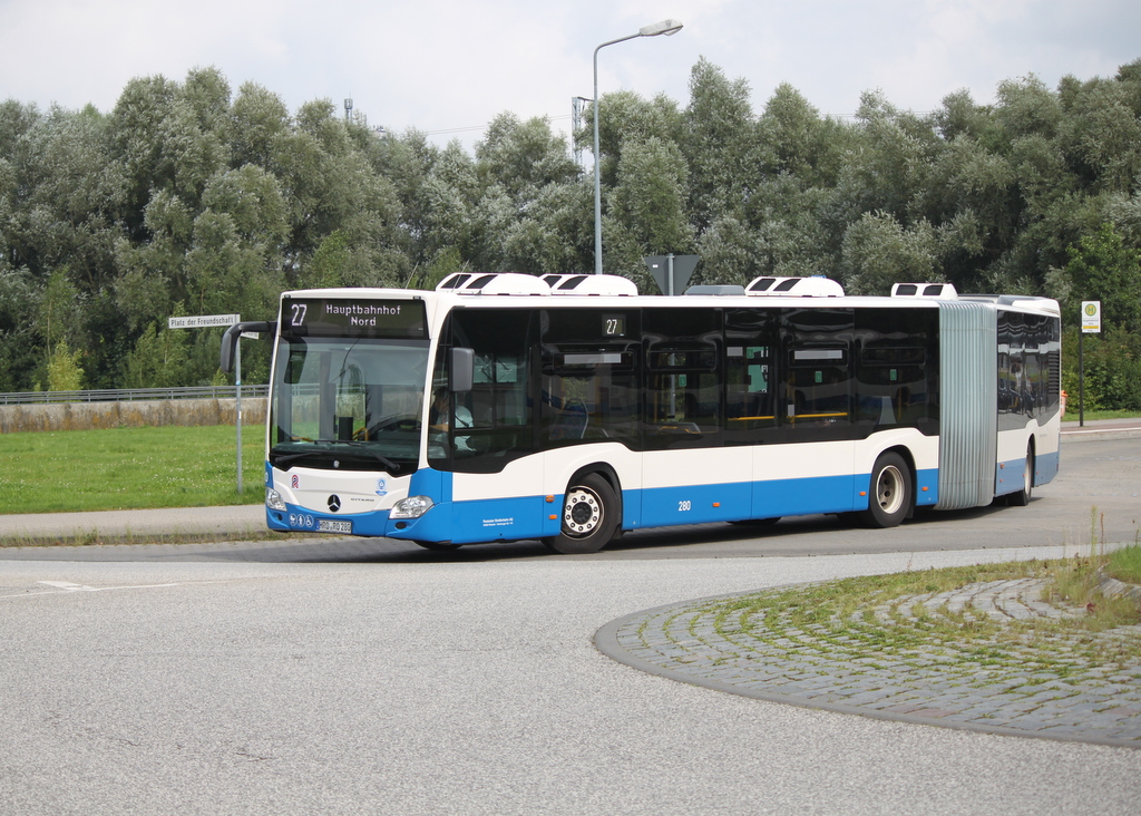 der Neue Mercedes Citaro C2-G als Linie 27 Klinikum Schillingallee, Rostock nach Rostock Hauptbahnhof/Nord bei der Ausfahrt in der Haltestelle Rostock Hauptbahnhof/Süd.18.08.2017