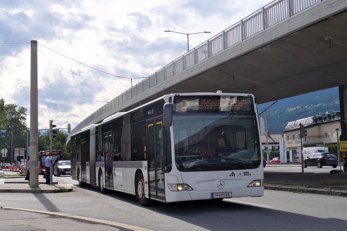 Mercedes Citaro Facelift der Innsbrucker Verkehrsbetriebe Linie O, Bus Nr. 411, ist wegen Straßenbahn-Bauarbeiten in der Schützenstraße über die Haller Straße umgeleitet. Aufgenommen 27.7.2017.
