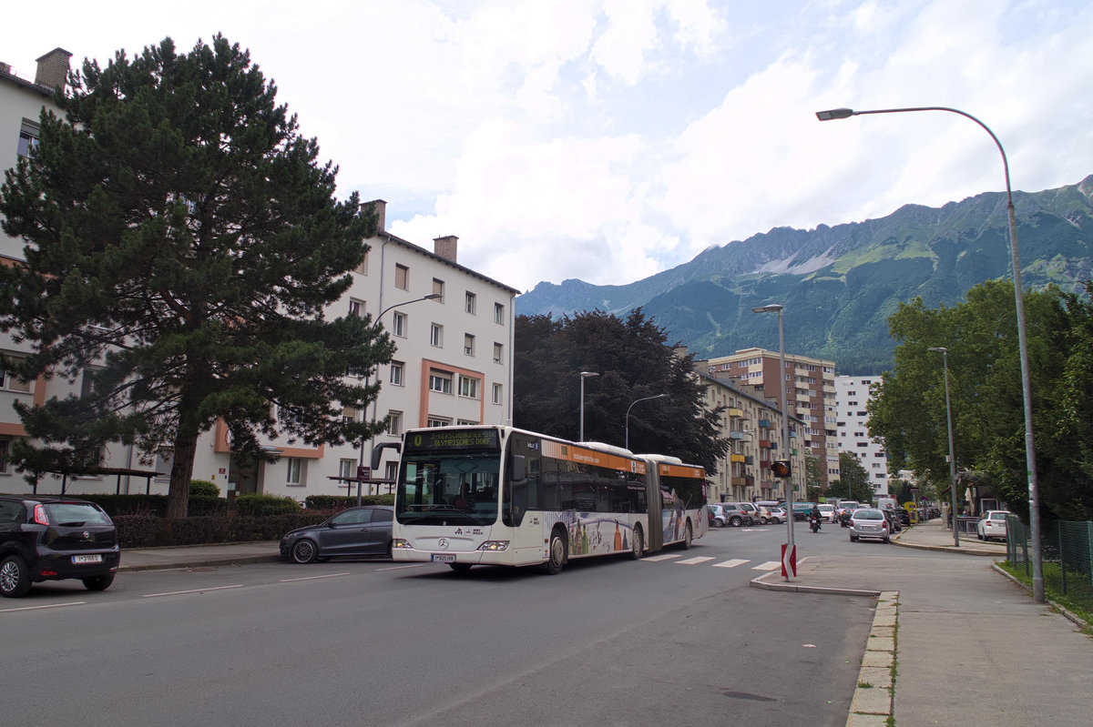 Mercedes Citaro III der Innsbrucker Verkehrsbetriebe Linie O, Bus Nr. 428, ist wegen Straßenbahn-Bauarbeiten in der Reichenauer Straße über die Burghard-Breitner-Str. umgeleitet. Aufgenommen 27.7.2017.