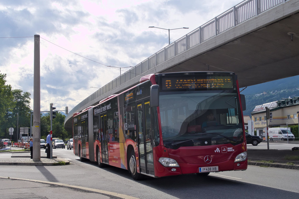 Mercedes Citaro III der Innsbrucker Verkehrsbetriebe Linie O, Bus Nr. 438, ist wegen Straßenbahn-Bauarbeiten in der Schützenstraße über die Haller Straße umgeleitet. Aufgenommen 27.7.2017.