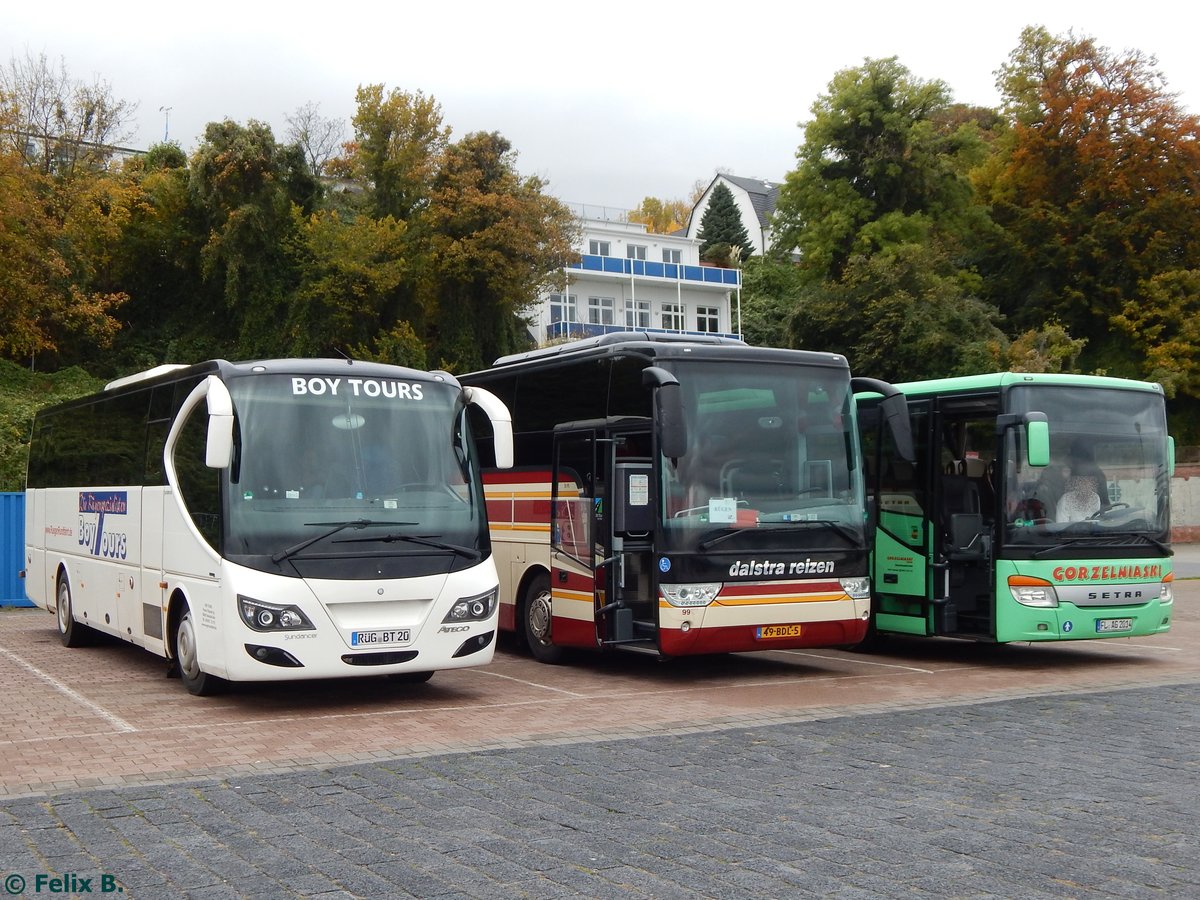 Mercedes Sundancer von BoyTours aus Deutschland und Van Hool TX16 von Dalstra Reizen aus den Niederlanden und Setra 415 H von Gorzelniaski aus Deutschland im Stadthafen Sassnitz am 22.10.2016
