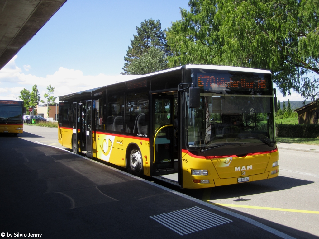 Postauto/PU Motrag Nr. 216 (MAN A20 Lion's City, ex. PU Stutz) am 4.7.2017 in Rafz als Linie 670 nach Winterthur. Wie lange die 52-minütige Postauto-Reise von Rafz nach Winterthur noch möglich ist, ist ungewiss. Postauto plant ab Dezember 2018 die Linie 670 auf den Abschnitt Winterthur - Flaach einzukürzen, statt dessen die Linie 675 (Henggart - Flaach) nach Rafz zu verlängern.
