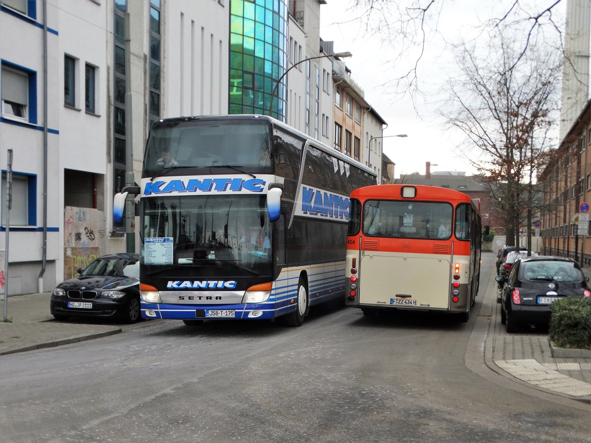 Setra Kantic Doppeldecker trifft auf VGF Mercedes Benz O305 am 09.12.17 in Frankfurt am Main