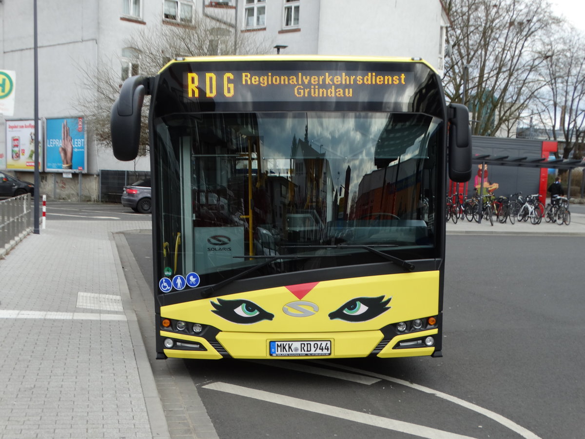 Regionalverkehrsdienst Gründe Solaris Urbino 12 mit Augen am 27.02.17 in Gelnhausen Bahnhof