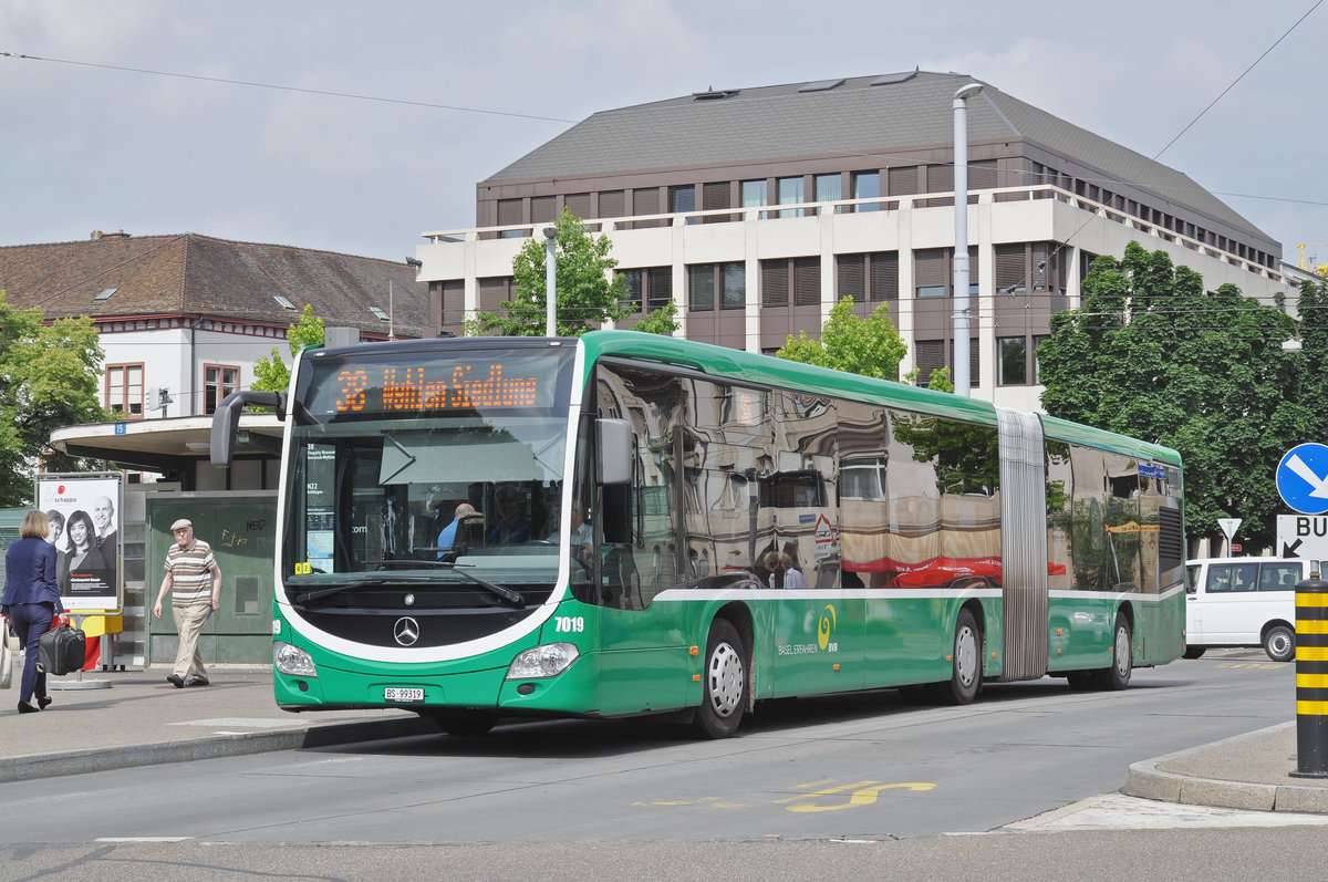 Mercedes Citaro 7019, auf der Linie 38, bedient die Haltestelle Wettsteinplatz. Die Aufnahme stammt vom 01.06.2017.