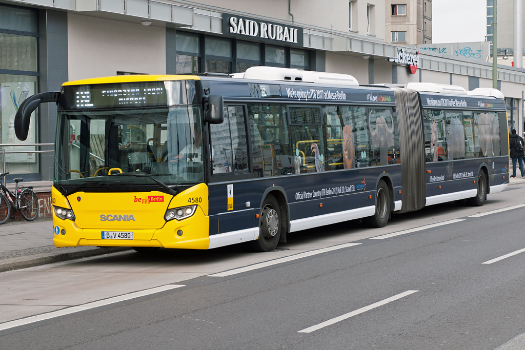Scania Citywide der BVG, Wagen 4580 'ilovebotswana' (Partnerland, ITB '17) am Flughafen Berlin -Tegel im März 2017.