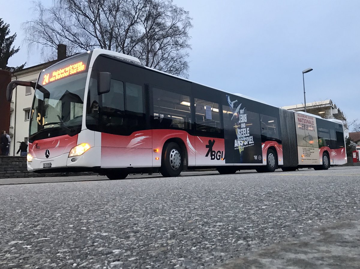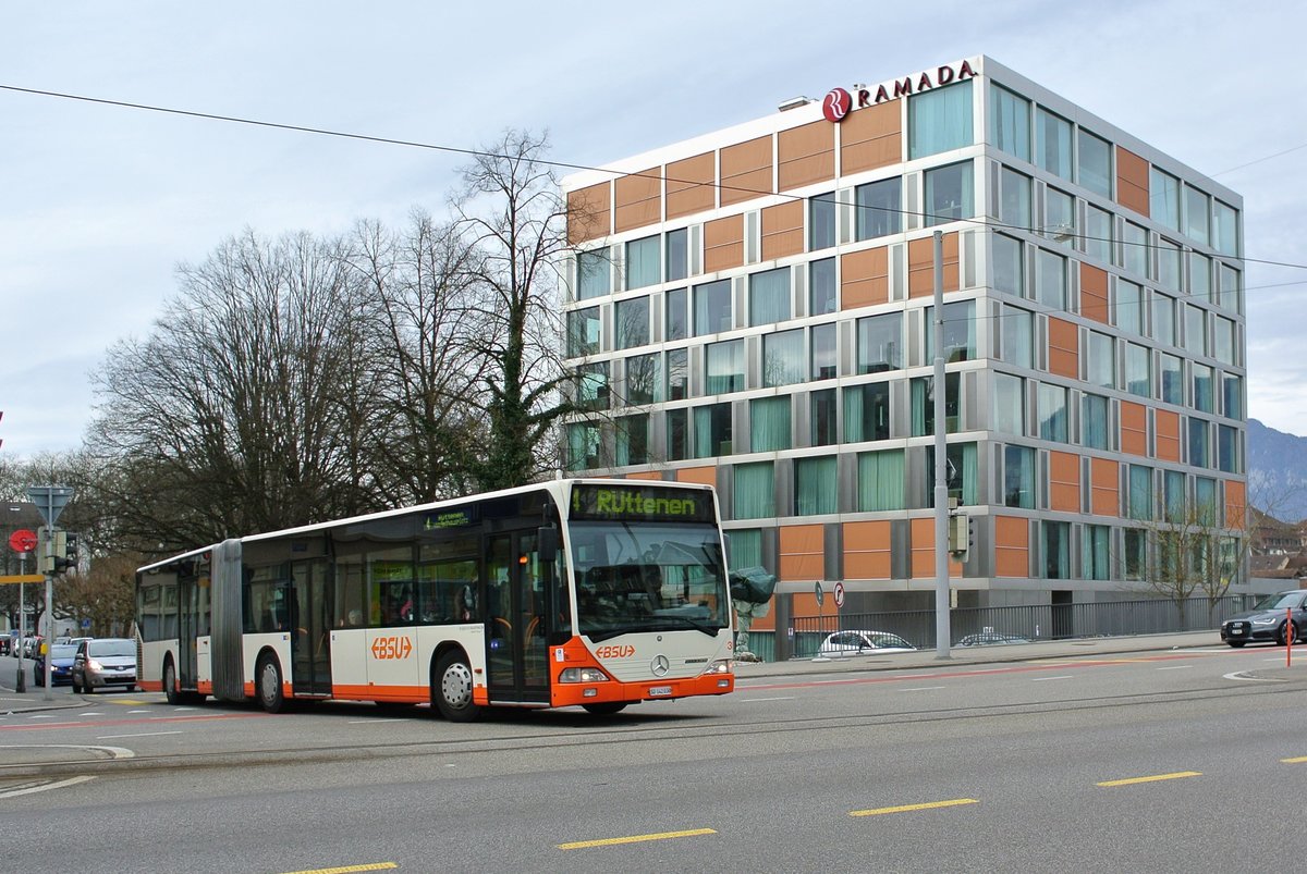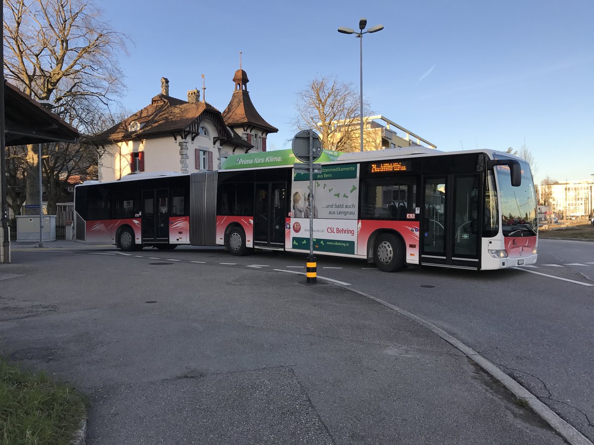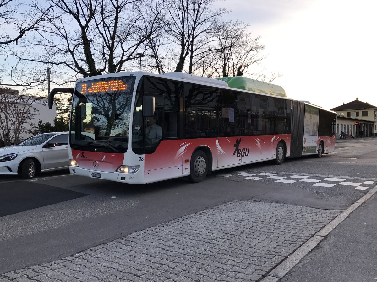Der Citaro Gelenkbus Nr. 28 auf der Linie 21 Richtung Lingeriz, am 10.3.17 kurz vor dem Bhf Süd.