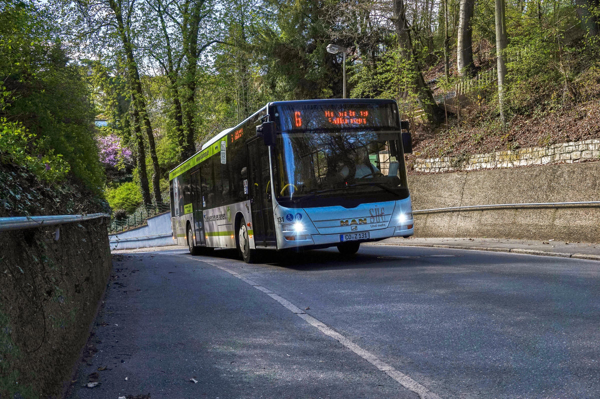 Ein MAN CNG Niederflurbus (Nr. 124) der SÜC, fährt am 11.4.2017 den Judenberg in Coburg hinauf.