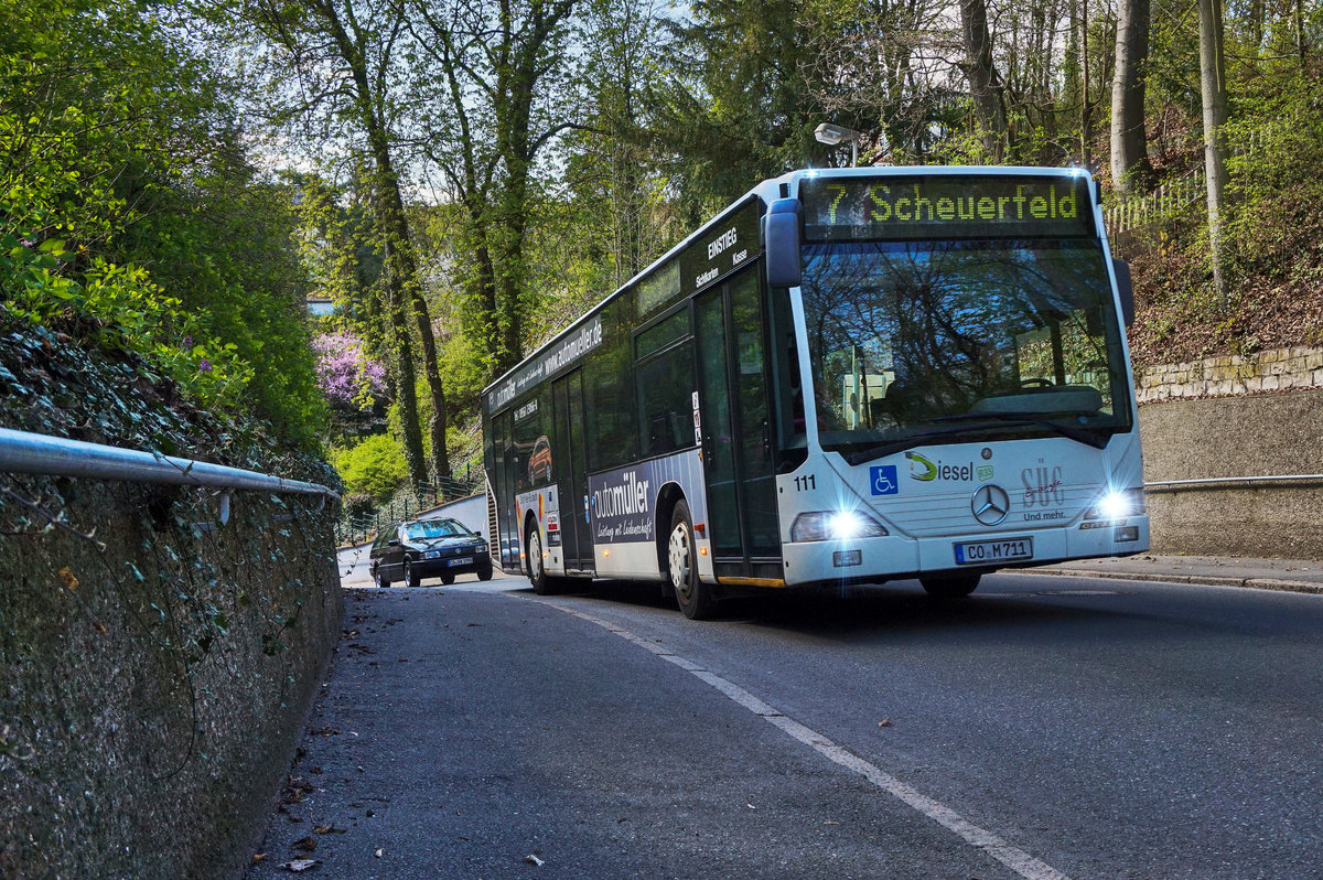 Ein Mercedes-Benz O 530 I (Nr. 111) der SÜC, fährt am 11.4.2017 aufgrund einer Umleitung statt über Rummental, den Judenberg hinauf.
