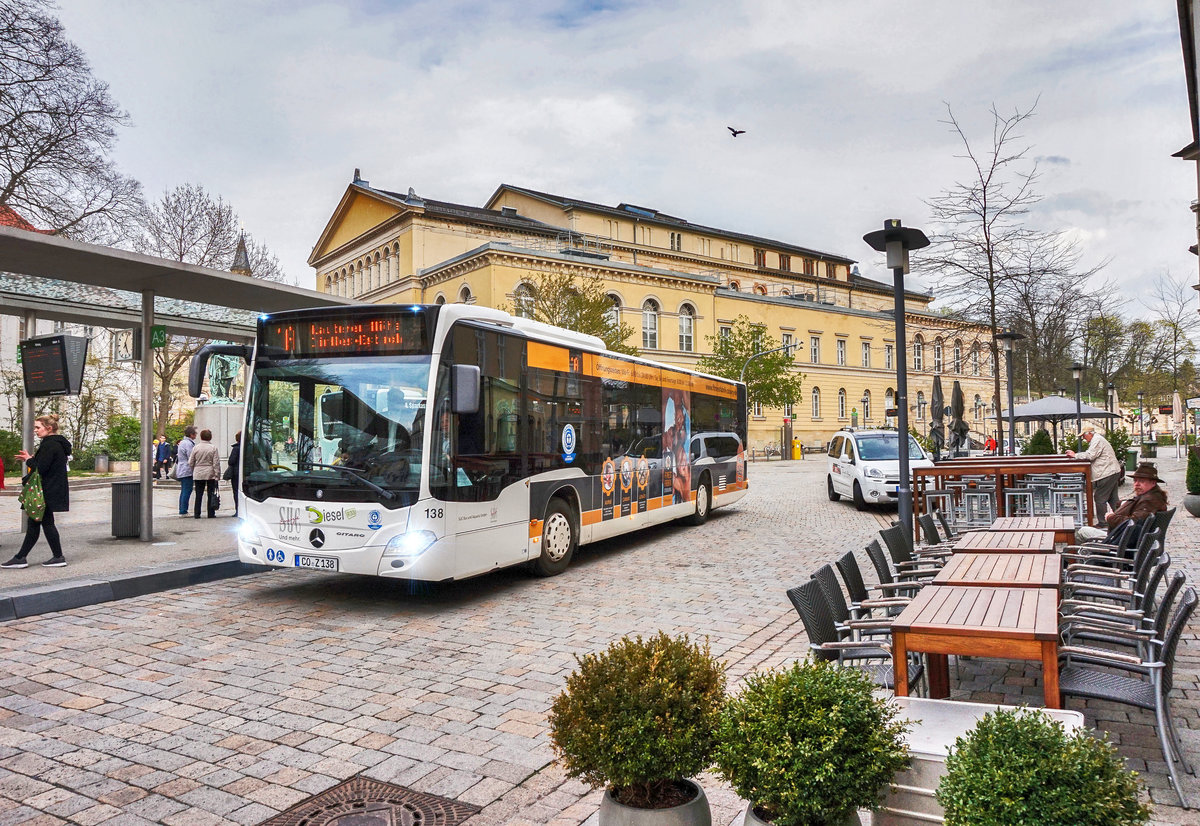 Ein Mercedes-Benz O 530 III (Nr. 138) der SÜC, fährt am 10.4.2017 in die Haltestelle Theaterplatz ein.