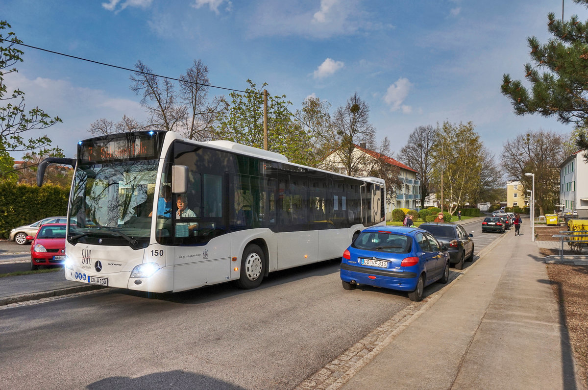 Ein Mercedes-Benz O 530 III (Nr. 150) der SÜC, hält am 10.4.2017 an der Haltestelle Coburg, Weimarer Straße.