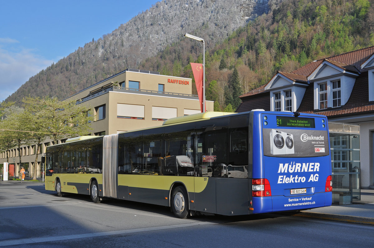MAN Lions City 146, auf der Linie 21, fährt zur Endstation beim Bahnhof Interlaken Ost. Die Aufnahme stammt vom 20.04.2017.