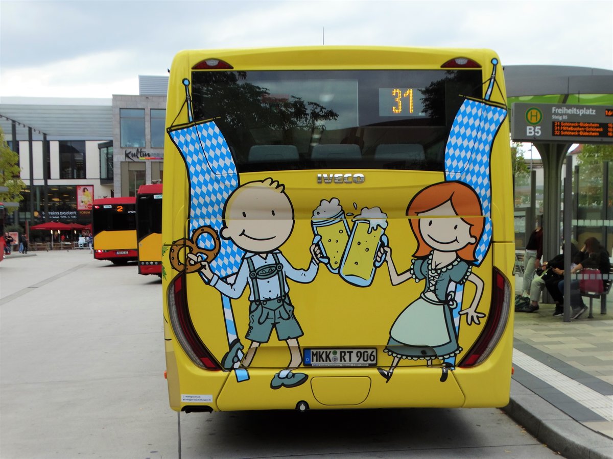 Racktours IVECO Irisbus Crossway mit neuer Beklebung am 06.09.17 in Hanau Freiheitsplatz.