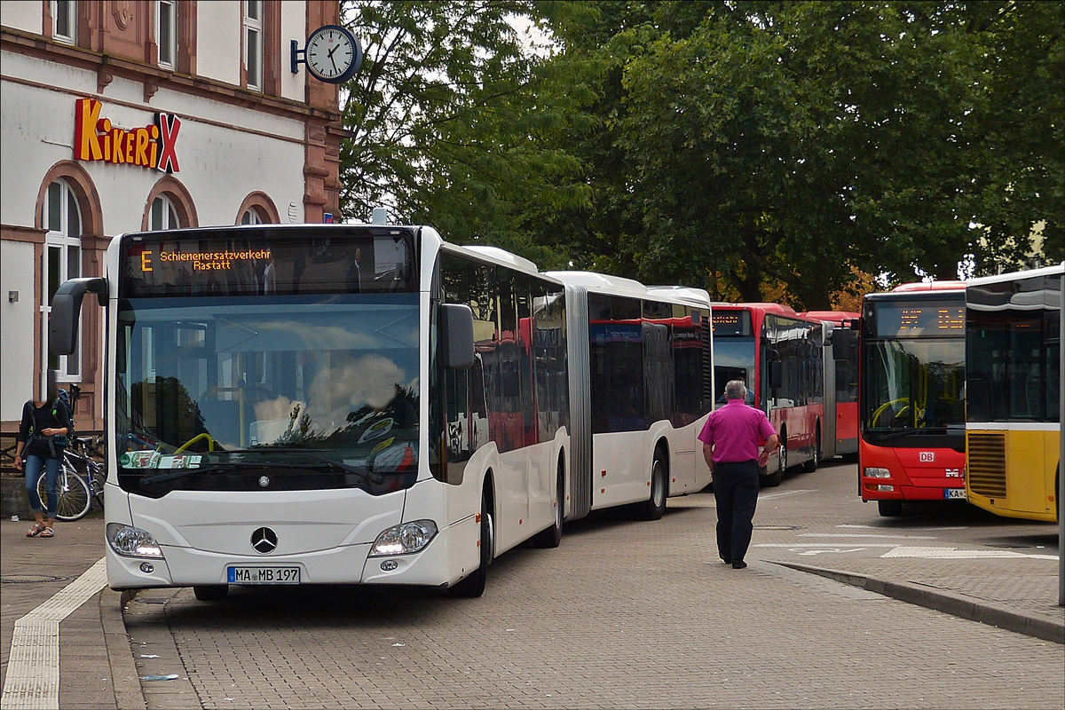 . Mercedes Benz Citaro aufgenommen am Bahnhof von Baden Baden. hier stehen am 03.09.2017 mehrere Busse bereit um die Passagiere des in Kürze einfahrenden ICE aufzunehmen und diese zum Bahnhof von Rastatt zu bringen, wo die Passagiere wieder in einen ICE einsteigen können und somit ihre Reise per Bahn fortsetzen können.