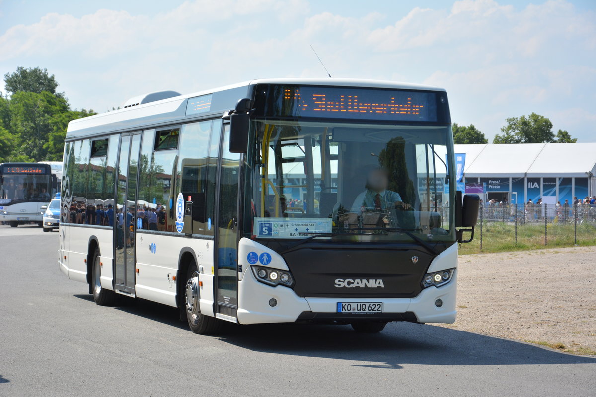 Am 04.06.2016 fährt KO-UQ 622 für die ILA 2016 Shuttle zwischen Parkplatz und ILA-Gelände. Aufgenommen wurde ein Scania Citywide LE.
