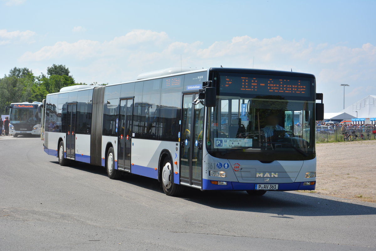 Am 04.06.2016 fährt P-AV 361 für die ILA 2016 Shuttle zwischen Parkplatz und ILA-Gelände. Aufgenommen wurde ein MAN Lion's City G der BVSG, Betriebshof Werder (Havel).