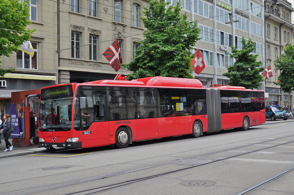 Mercedes Citaro 842, auf der Linie 17, bedient die Haltestelle beim Bahnhof Bern. Die Aufnahme stammt vom 09.06.2017.
