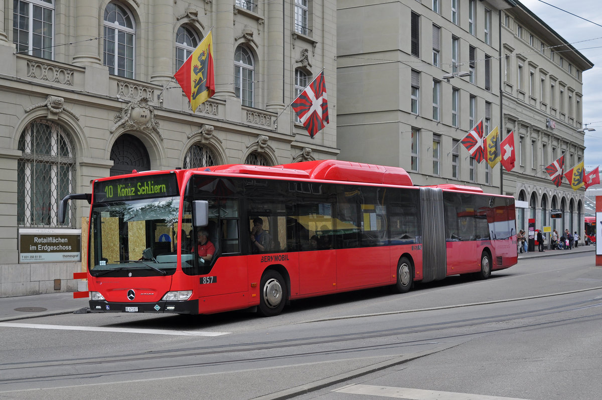 Mercedes Citaro 857, auf der Linie 10, bedient die Haltestelle beim Bahnhof Bern. Die Aufnahme stammt vom 09.06.2017.