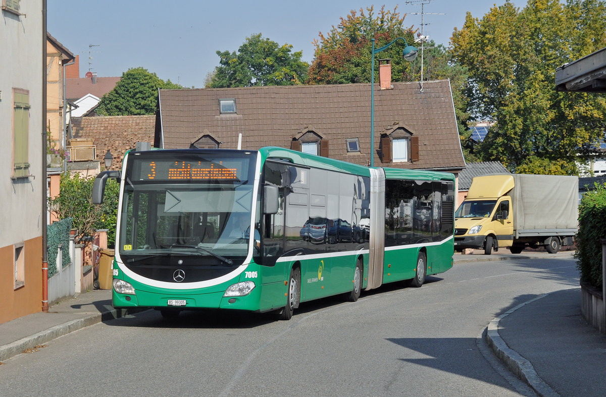 Mercedes Citaro 7005 auf der Tram Ersatzlinie 3, die wegen der Baustelle am Steinenberg nicht verkehren kann. Nach dem bedienen der Endhaltestelle Burgfelderhof fahren die Busse zum Wenden ein kurzes Stück nach St. Louis. Die Aufnahme stammt vom 25.09.2017.