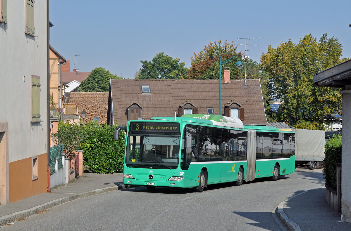 Mercedes Citaro 702 auf der Tram Ersatzlinie 3, die wegen der Baustelle am Steinenberg nicht verkehren kann. Nach dem bedienen der Endhaltestelle Burgfelderhof fahren die Busse zum Wenden ein kurzes Stück nach St. Louis. Die Aufnahme stammt vom 25.09.2017.