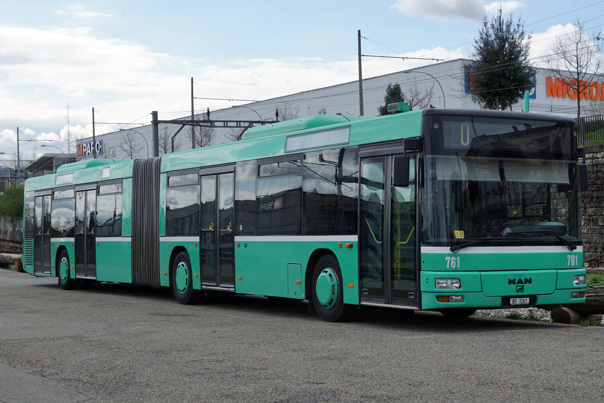 Infolge Platzmangel warten einige MAN Gelenkbusse aus dem Jahre 2000 bei der SBB Zentralwerkstatt Basel unter freiem Himmel auf ihre Reserveeinsätze.
